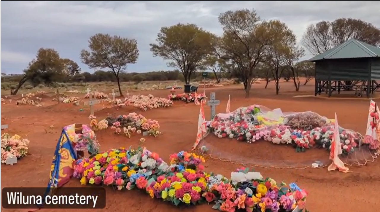 In a remote Aboriginal town we stopped at the cemetery, where the hard sun-cooked earth was decorated in dozens of new graves. Each covered from head to toe in brightly coloured fake flowers.